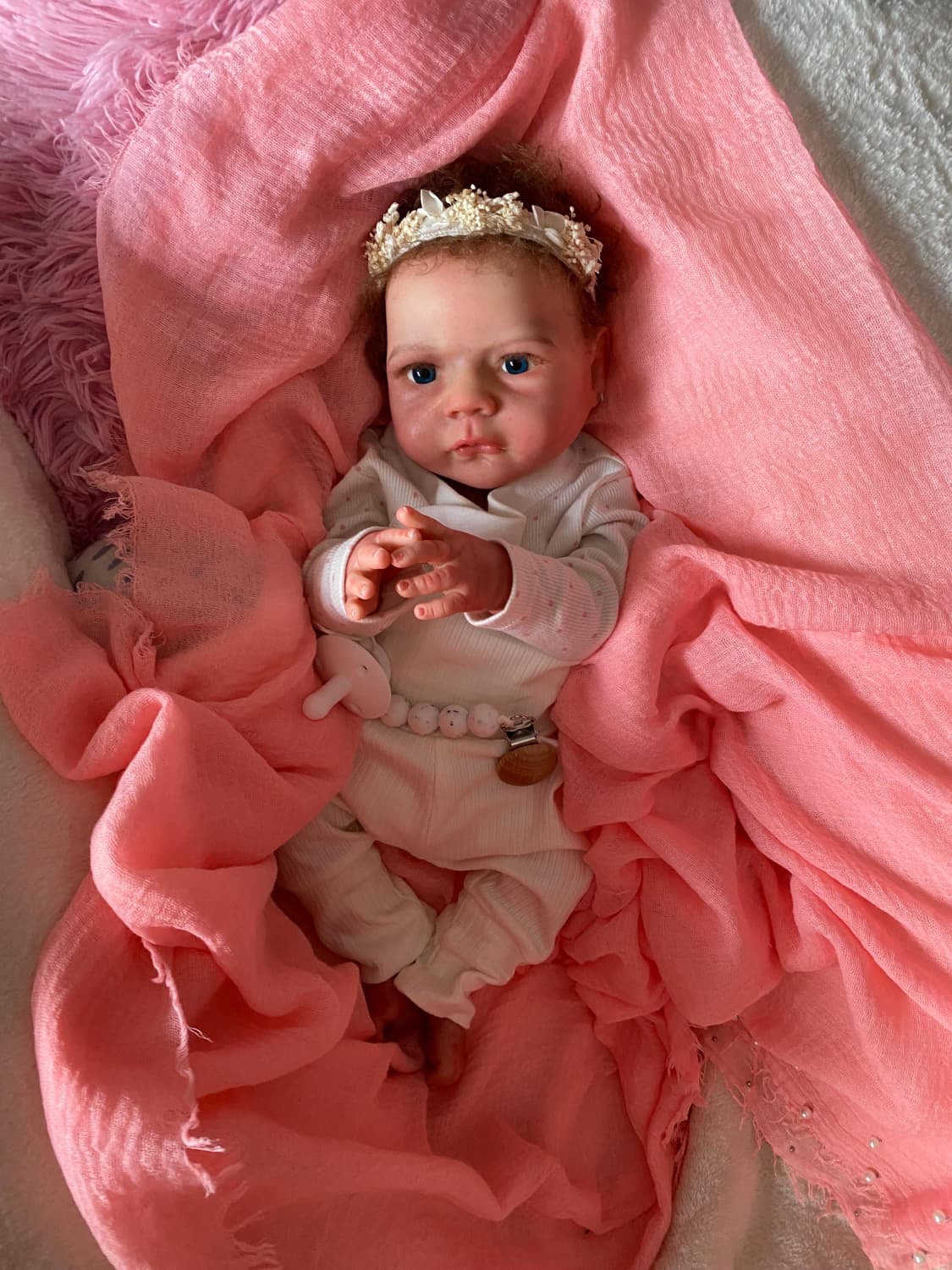 While many dolls claim to be realistic, Emma’s hyper-realistic features genuinely blur the line between art and reality. The combination of full platinum silicone construction, hand-grafted mohair, and expert painting techniques creates a doll that consistently earns gasps of amazement from everyone who sees her.