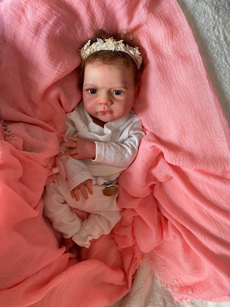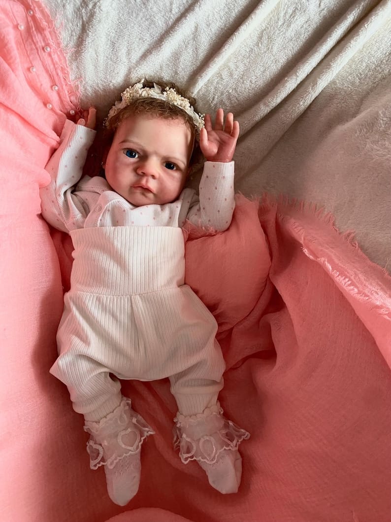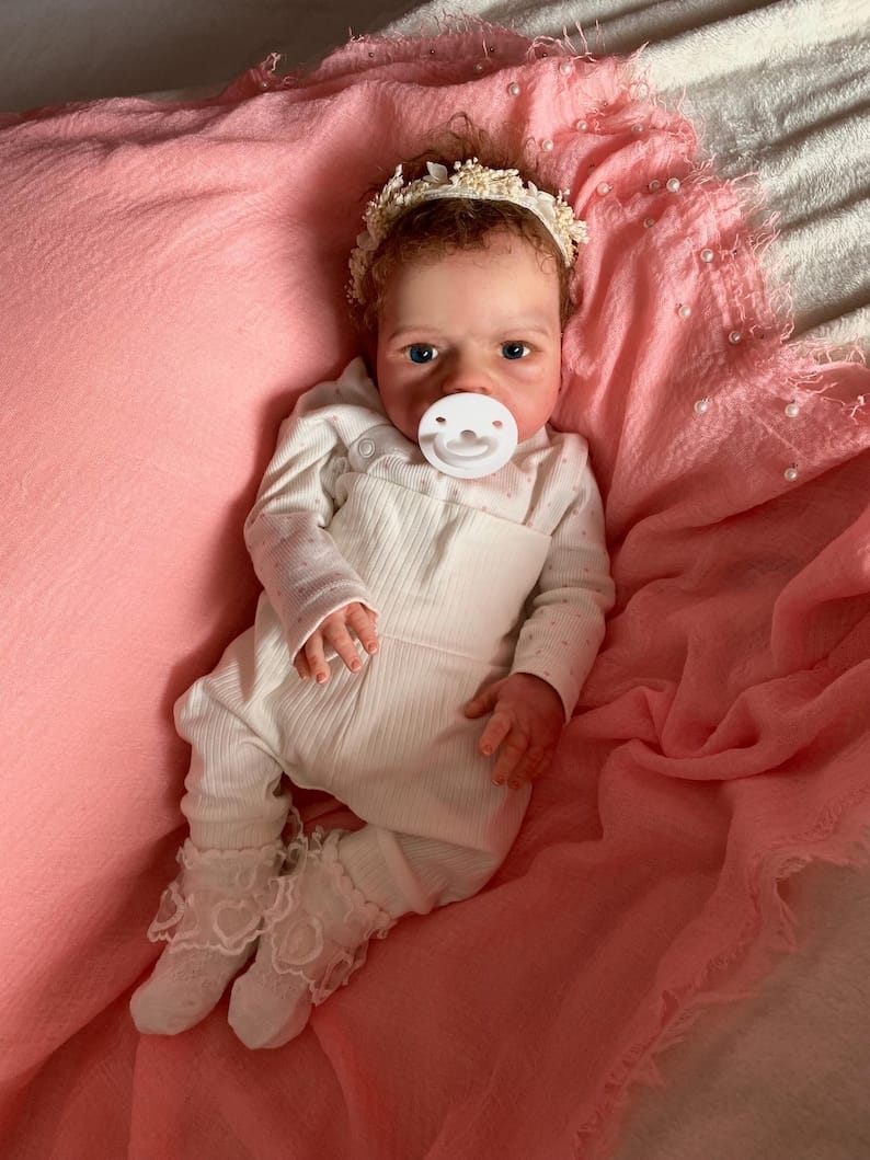 But what truly sets Emma apart is her magnificent crown of brown curly mohair. Each individual strand has been meticulously grafted into her scalp using specialized micro-rooting techniques—a painstaking process that can take days to complete. The result? Silky-soft, touchable hair that you can gently brush, style, and admire. Her delicately rooted eyelashes frame hand-painted eyes that seem to gaze up at you with innocent wonder, while her feathered eyebrows add the perfect finishing touch to her angelic expression.
