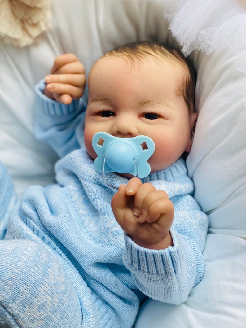 The attention to detail extends to every inch of this beautiful baby boy. His painted hair and eyebrows are applied with meticulous precision, creating the soft, wispy appearance of newborn hair. His rooted eyelashes are individually inserted and permanently sealed inside for lasting beauty and durability. Even his tiny fingernails and toenails have been carefully tipped with paint and sealed to mimic the delicate nails of a real newborn. Moisture has been added to his mouth, creating that sweet, slightly parted-lip expression that newborns naturally display.