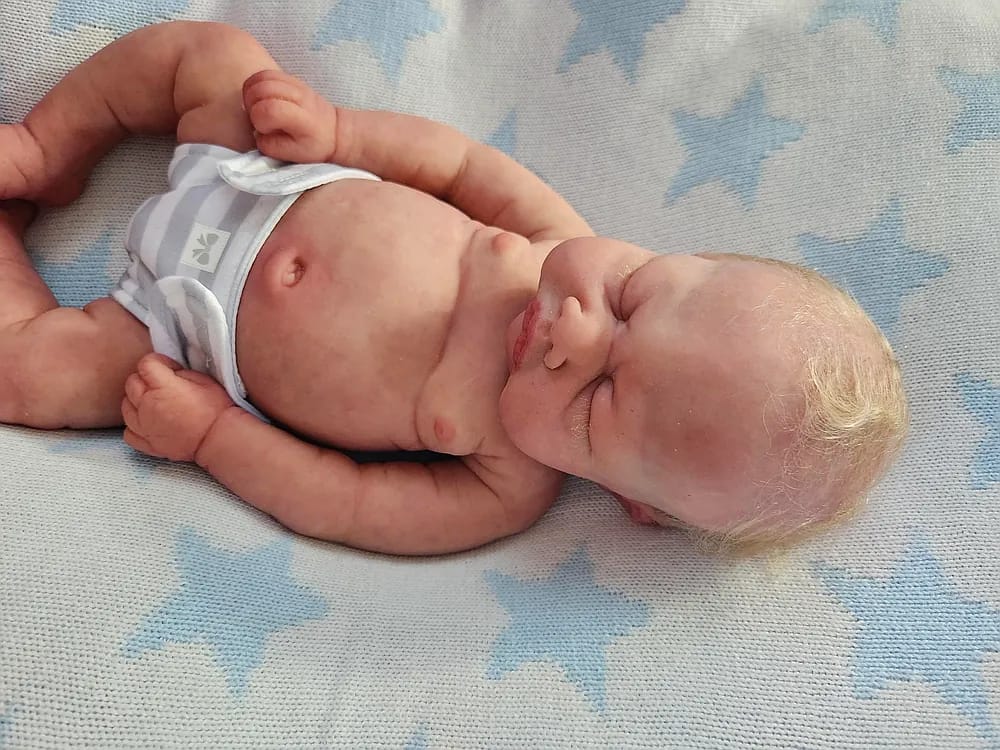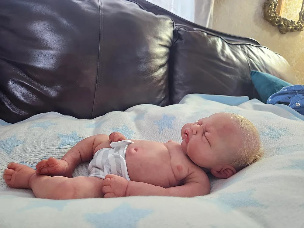 - Mottled Skin Artistry – Authentic mottled skin tones created with professional silicone paint that mimics real newborn coloring
