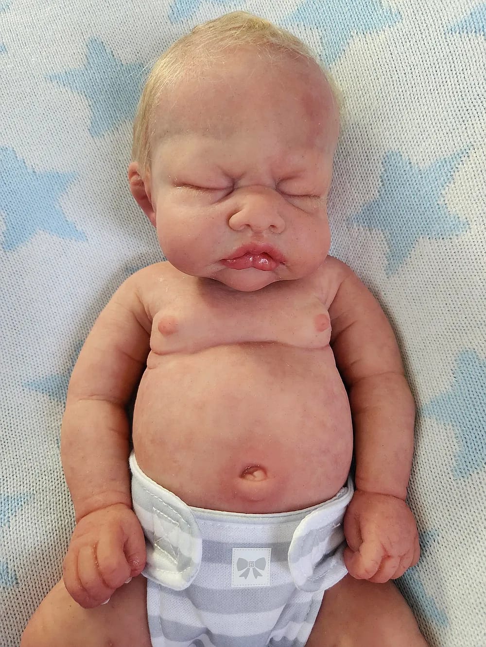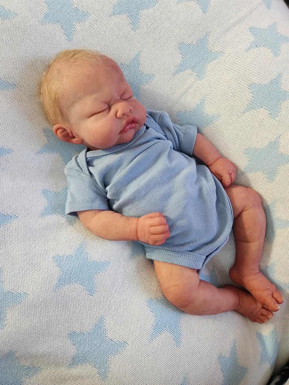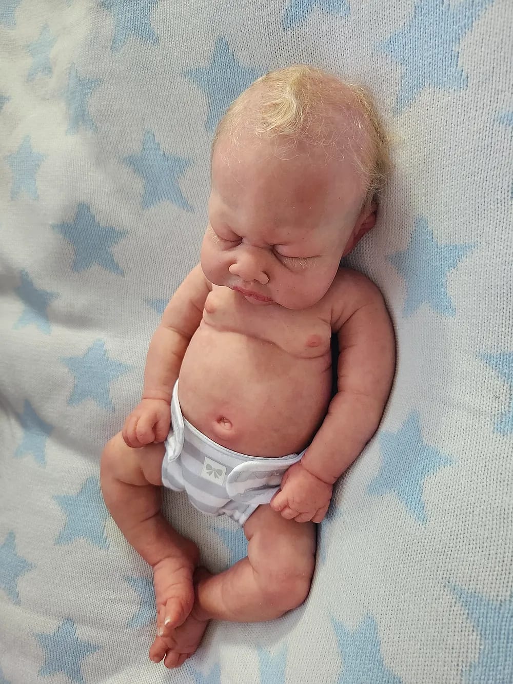 The artistry continues with Mateo’s hand-rooted hair, where individual strands have been painstakingly inserted by hand to create the wispy, soft appearance of a preemie’s delicate locks. His rooted eyelashes frame gently closed eyes, creating a peaceful sleeping expression that radiates tranquility. Every crease, every wrinkle, every tiny fingernail has been sculpted and painted with meticulous attention to detail, making this silicone reborn baby boy a true work of art.