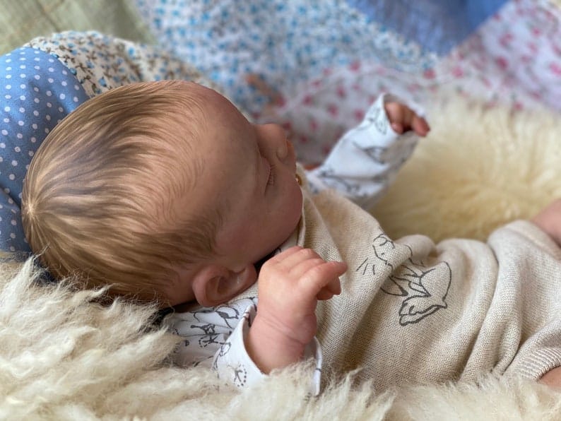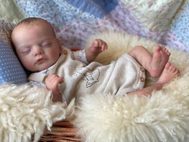 His painted hair and eyebrows are applied with meticulous precision, stroke by tiny stroke, creating the soft appearance of a newborn’s fine hair. The moisture applied to his lips gives them that slightly glossy, kissable look that real babies have, adding yet another layer of realism that collectors appreciate in high-quality reborn baby dolls boy.
